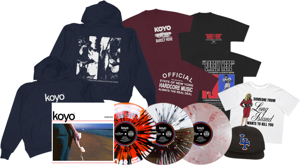 Produced, engineered, and mixed by longtime collaborator Jon Markson (Drug Church, Drain, The Story So Far), Barely Here is a lean 10-song, 28-minute blast of incredibly anthemic punk. The band’s familiar Long Island DNA is there–the firecracker guts of The Movielife, the widescreen hooks of Taking Back Sunday, the tuneful grit of Silent Majority–but the sound of Koyo themselves shines through more than ever, a confident band who know exactly what they want to make and excel at making it. “We definitely don’t spend as much time talking about our influences anymore,” says Chiaramonte. “We just know what kind of band we are and do what comes naturally.”